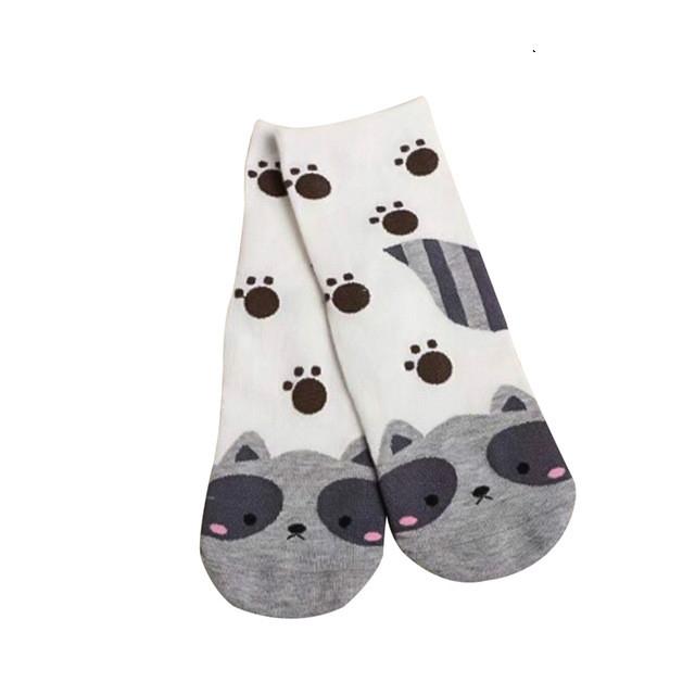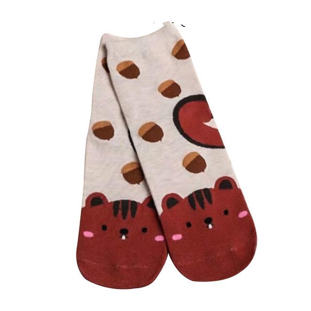 Sokker med søte dyr frampå foten. Hund, katt, ekorn og rev.