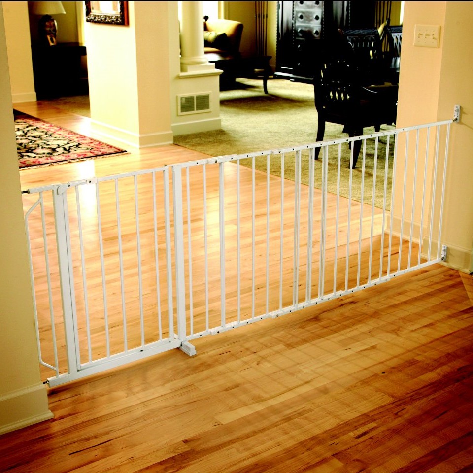 Grinden er spesialdesignet for å passe store rom og brede passasjer. Standardbredden kan justeres fra 94 til 152 cm, og med ekstra forlengelser på 61 cm kan den strekke seg helt opp til 396 cm. Dette gjør den perfekt til åpne stuepartier, store døråpninger og trapper.