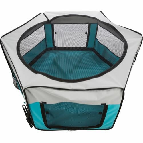 For tryggere opphold for kjæledyret tilbyr valpegrinden et avtakbart nettingtak som forhindrer at dyret hopper ut. Trixie Puppy Run er sammenleggbar for plassbesparende oppbevaring og leveres med en praktisk transportveske, noe som gjør den lett å ta med seg på turer.