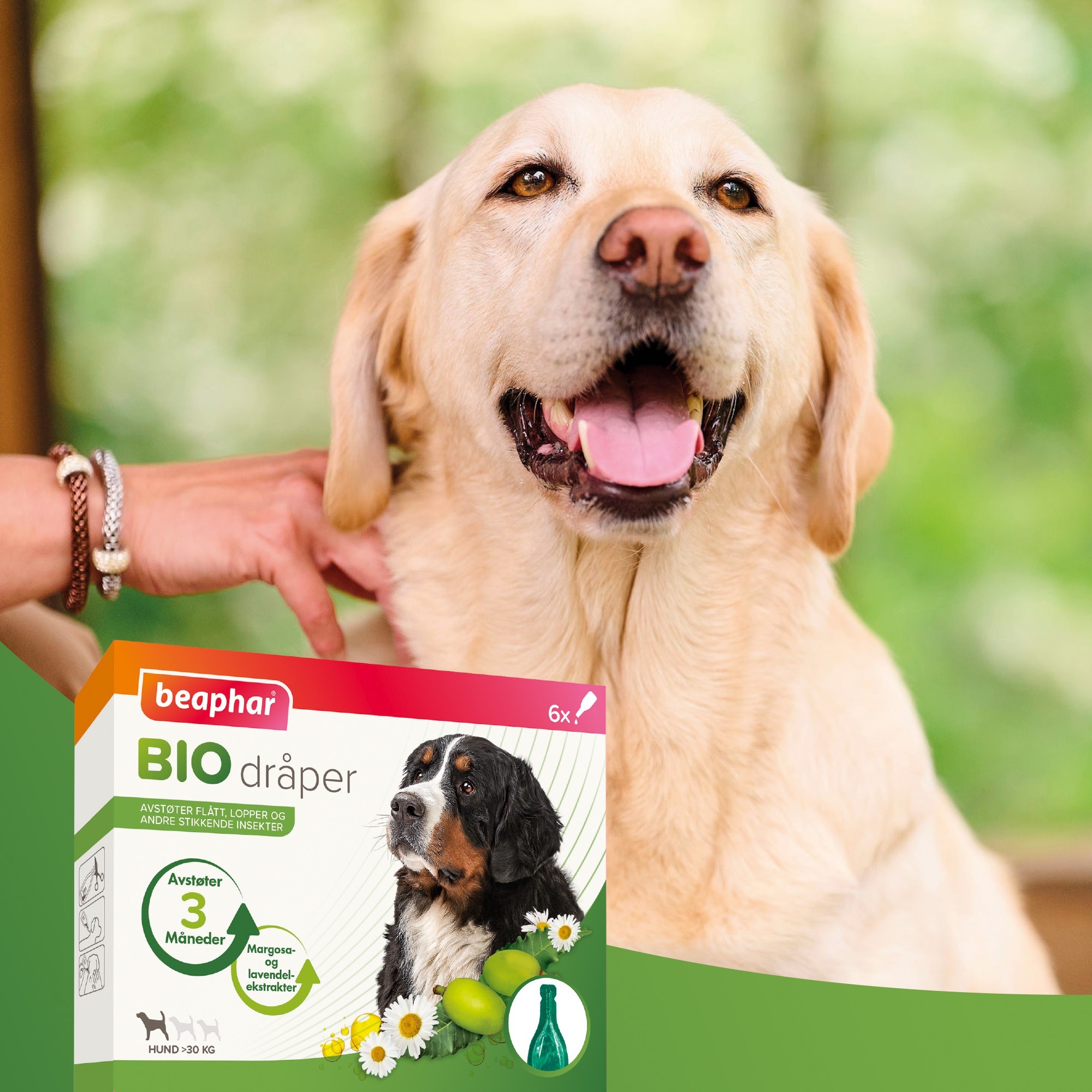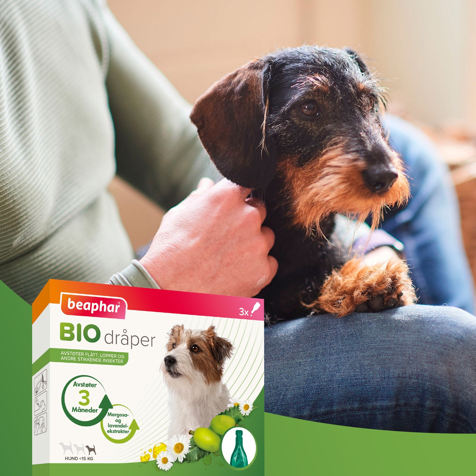 Beaphar Bio Spot-On er godt egnet til hunder eldre enn 12 uker. Pipettene inneholder naturlige ekstrakter av margosa (Neem), som er allment kjent for sin frastøtende egenskap mot insekter. Dersom hunden blir utsatt forkraftig nedbør eller bader, bør produktet påføres på nytt. Produktet forhindrer ikke 100 % mot at flått, lopper og andre bitende insekter fester seg til dyret.