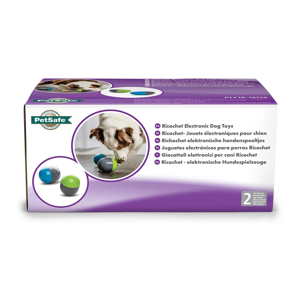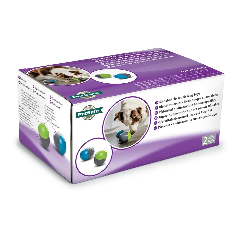 Ricochet består av to smarte elektroniske baller som kommuniserer trådløst med hverandre. Når hunden din nudger, dulter eller flytter på den ene ballen, aktiveres den og sender et lydsignal til den andre ballen som begynner å lage lyd. Dette oppfordrer hunden til å jakte på lydkilden, finne den andre ballen og interagere med den – og dermed starter leken på nytt i en kontinuerlig syklus som holder hunden engasjert.