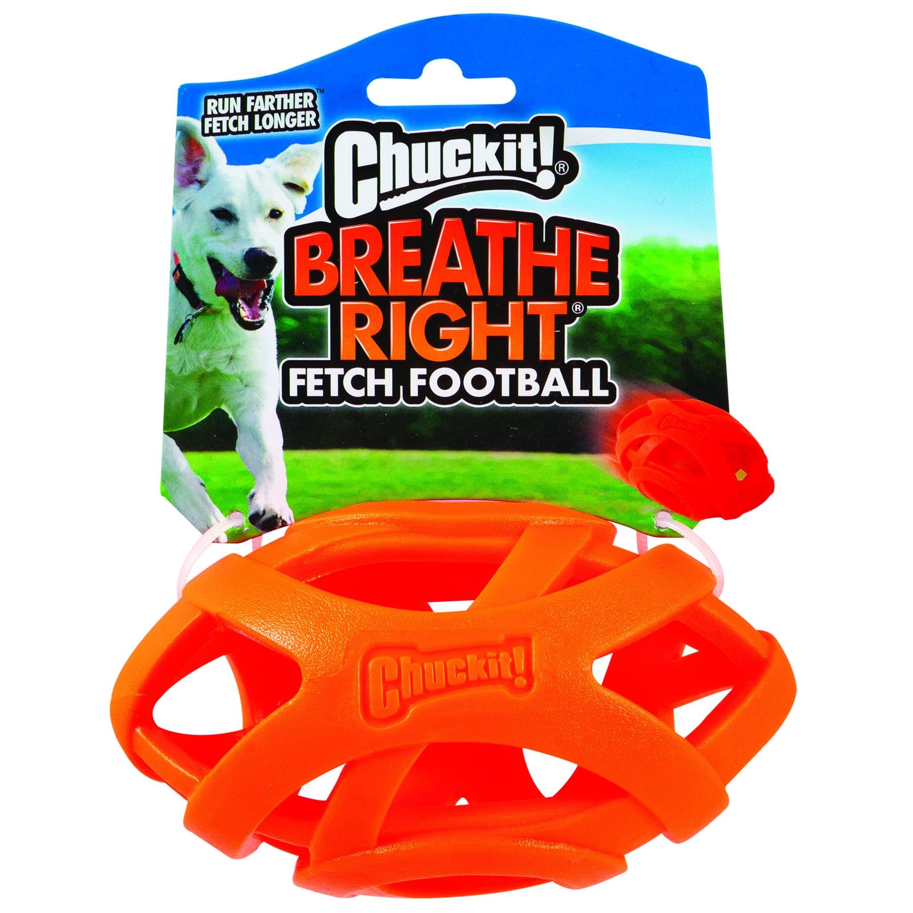 Chuckit! Air Fetch Football er en apporteringsleke i rugby/fotballform med åpen nettstruktur som tillater luftstrøm mens hunden holder leken i munnen. Den unike konstruksjonen gjør det enklere for hunden å puste under apportering sammenlignet med massive leker.