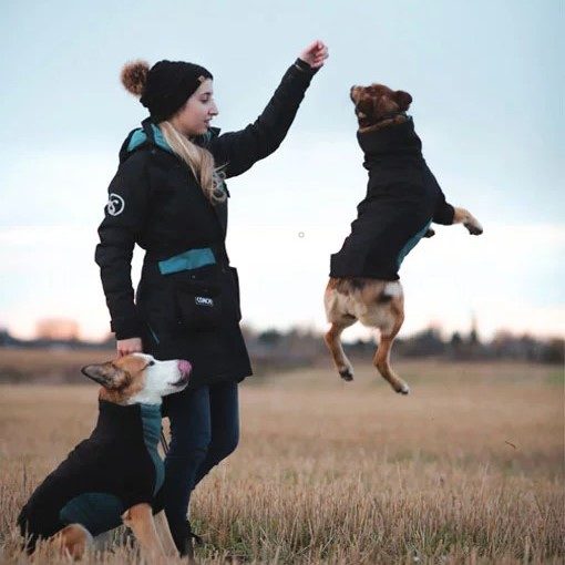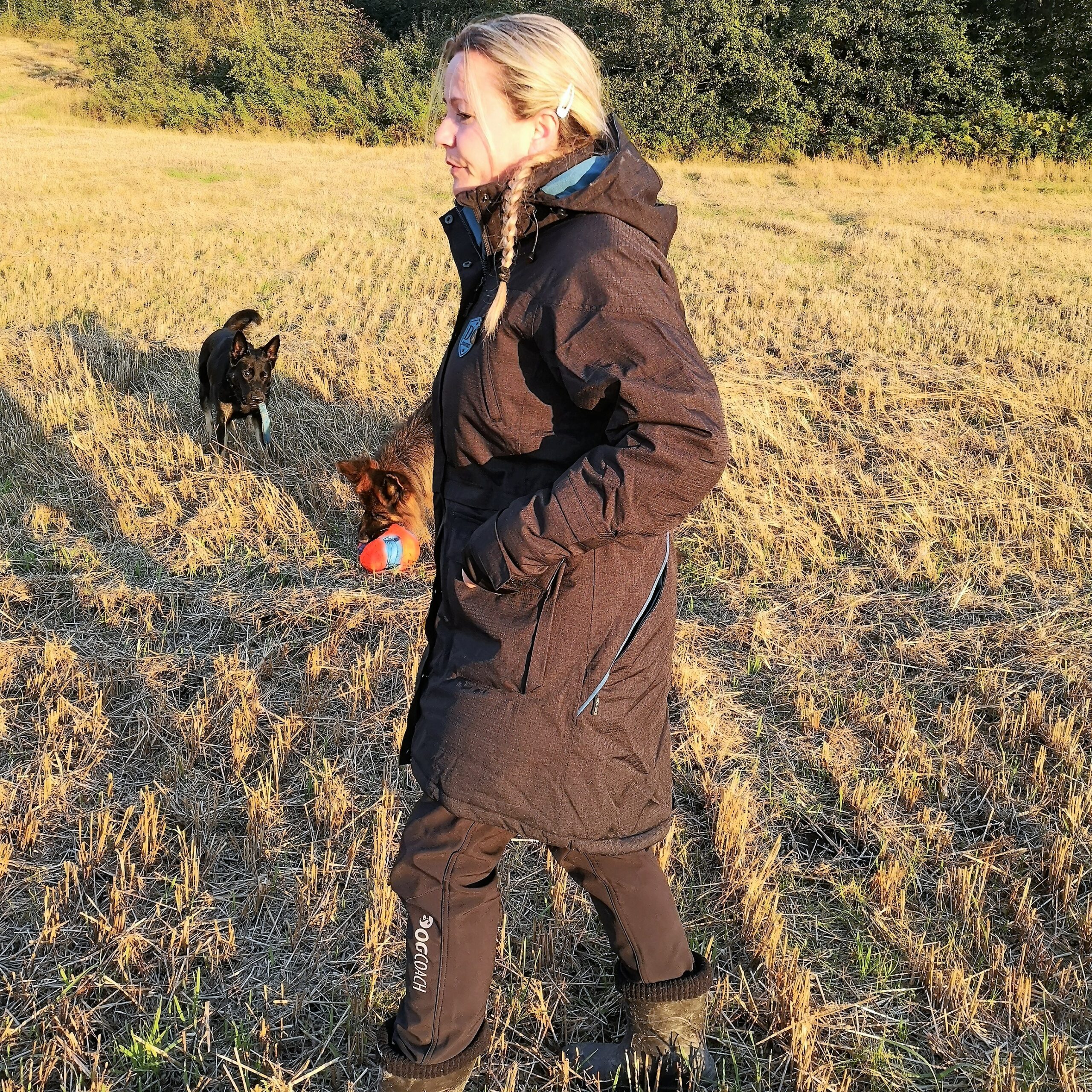 Her er din hundeluftejakke, som holder deg 100% tørr i regn og snø, er varm og vindtett, ser smart ut – samtidig samler den alt du trenger for hundetrening og lufting!